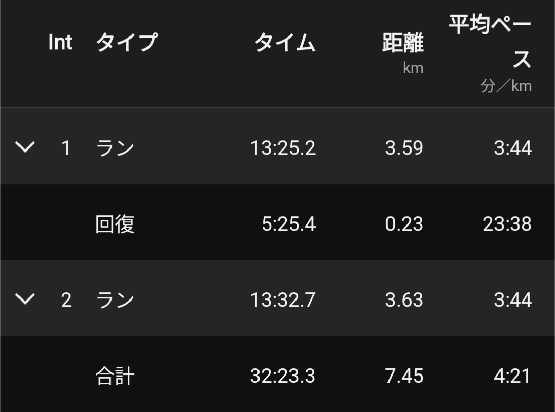 2本目はたぶん1人だったらやってない気がするけど、「キロ4かかっていい」という気持ちで力を抜いて走ったら後半は1本目よりも余裕が残ったので巻き返して7秒差程度に抑えられた。