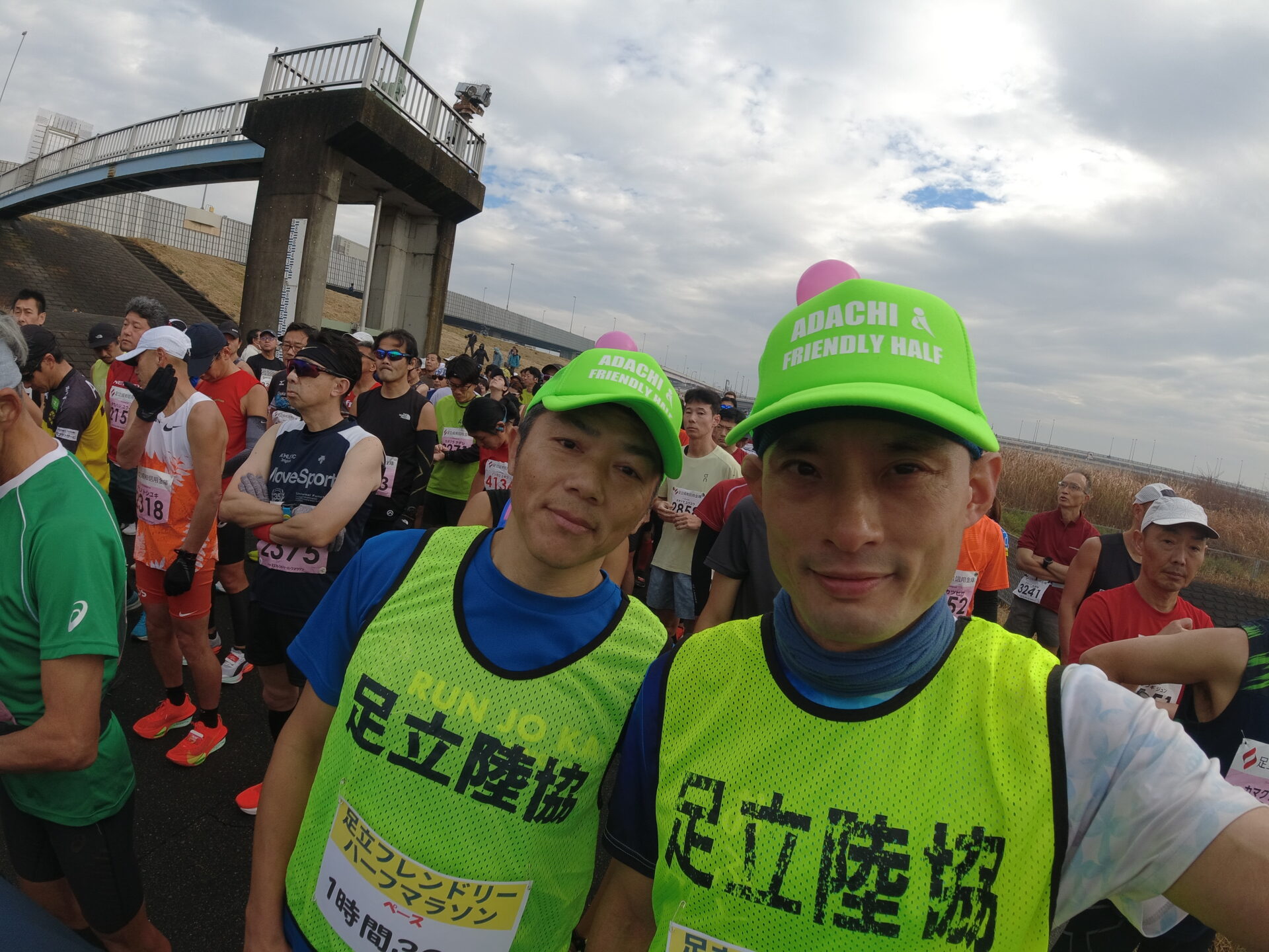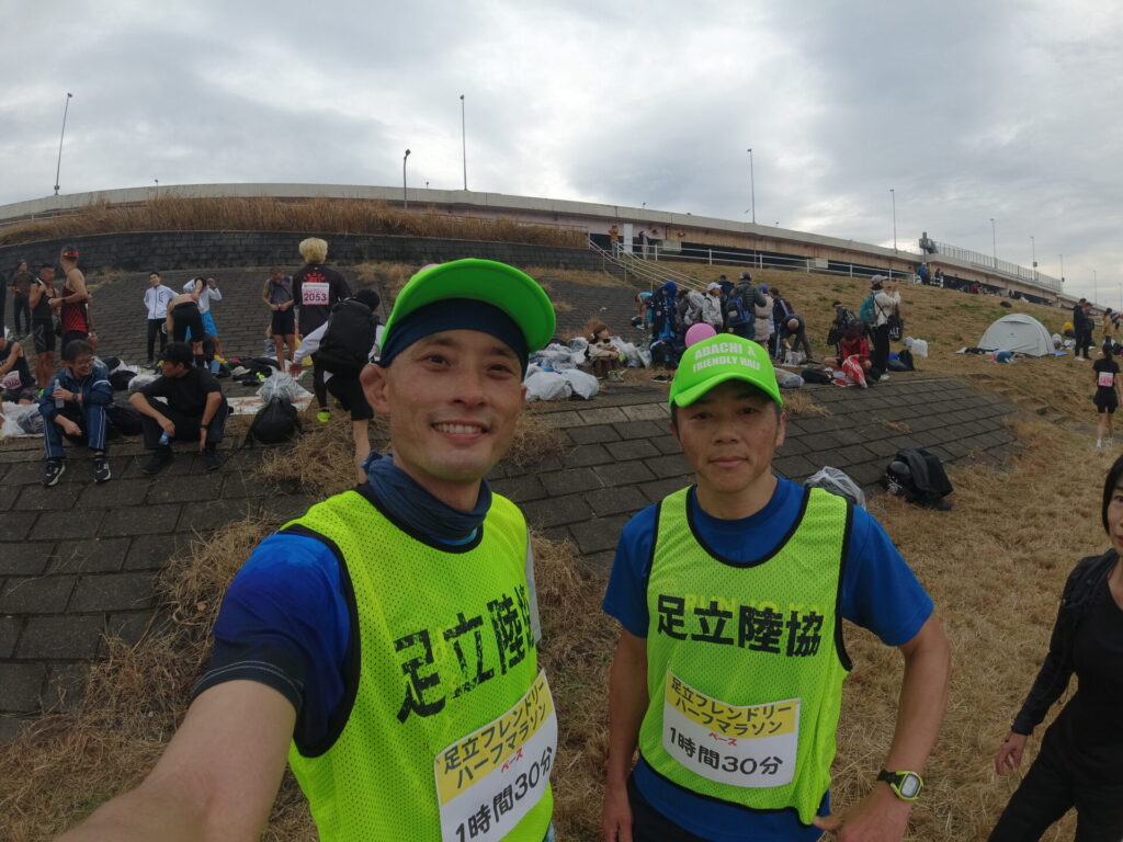 あとはレースを楽しみつつ、1人でも多く90分を切ってもらうこと。スタート前にセンセとアップをしたところ妙に暖かい。