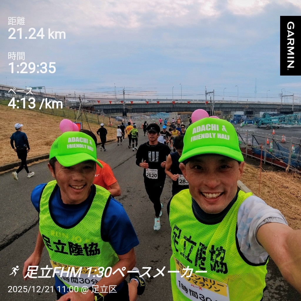 5kmおきに公式の距離表示地点で手動ラップしてズレを調整しつつ、ラスト2kmあたりから余裕のある人は先に送り出しつつ、90分が切れそうな後続のランナーに声をかけながらゴール。