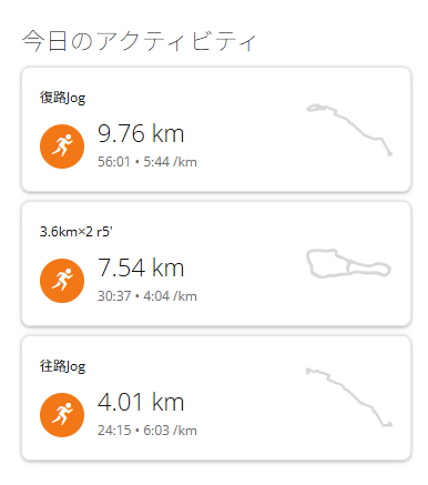 こういう内容をできる状態には全く戻っておらず、1200m3’20/kmとかでやったら1本でオールアウトしそうな気がしないでもない。