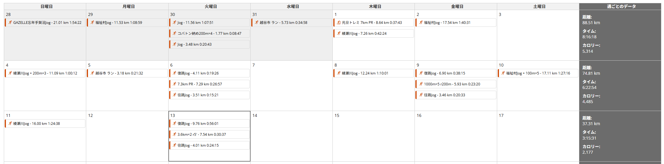 SNS投稿するときもブログ書く時もたいていスマホアプリのスクショを使ってたんだけど、Web版のGarmin Connect、カレンダー表示とかそこそこわかりやすく表示されていて良い。