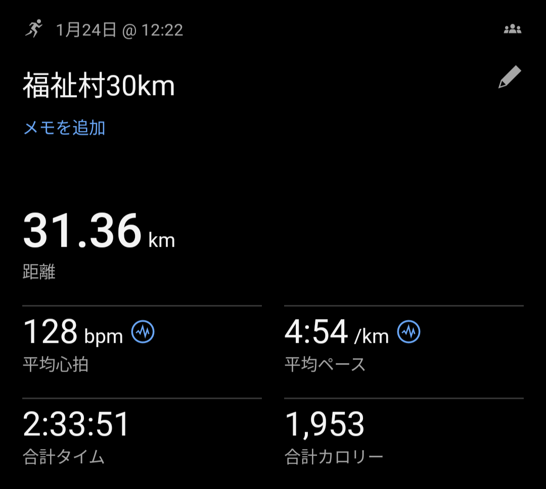 嫁さんは既に2回ほど30kmトレーニングを入れていたけど俺は…半年以内だと12/21の足立フレンドリーハーフ21km 4’15/kmが最長。